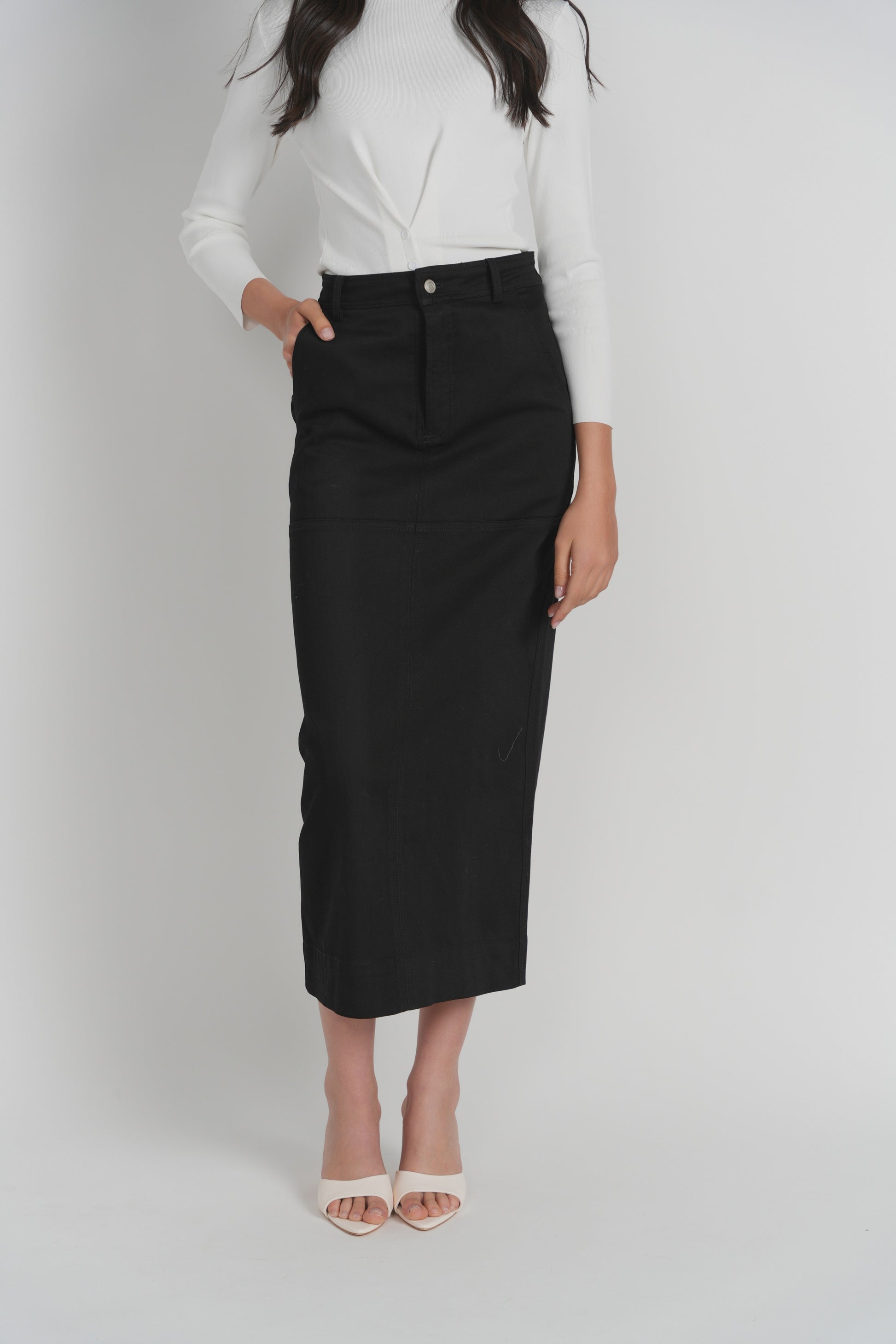 A timeless essential with a modern edge, the Elba Skirt is tailored in a sleek, structured silhouette that skims the body with effortless polish. Designed with a flattering high rise and a straight, elongated cut, it falls to a refined midi length for a look that feels both sophisticated and versatile. Thoughtful details—clean front closure, belt loops, and subtle seaming—add dimension while maintaining its streamlined aesthetic. Crafted in a structured yet comfortable fabric with a smooth finish, the Elba Skirt holds its shape beautifully while allowing ease of movement.