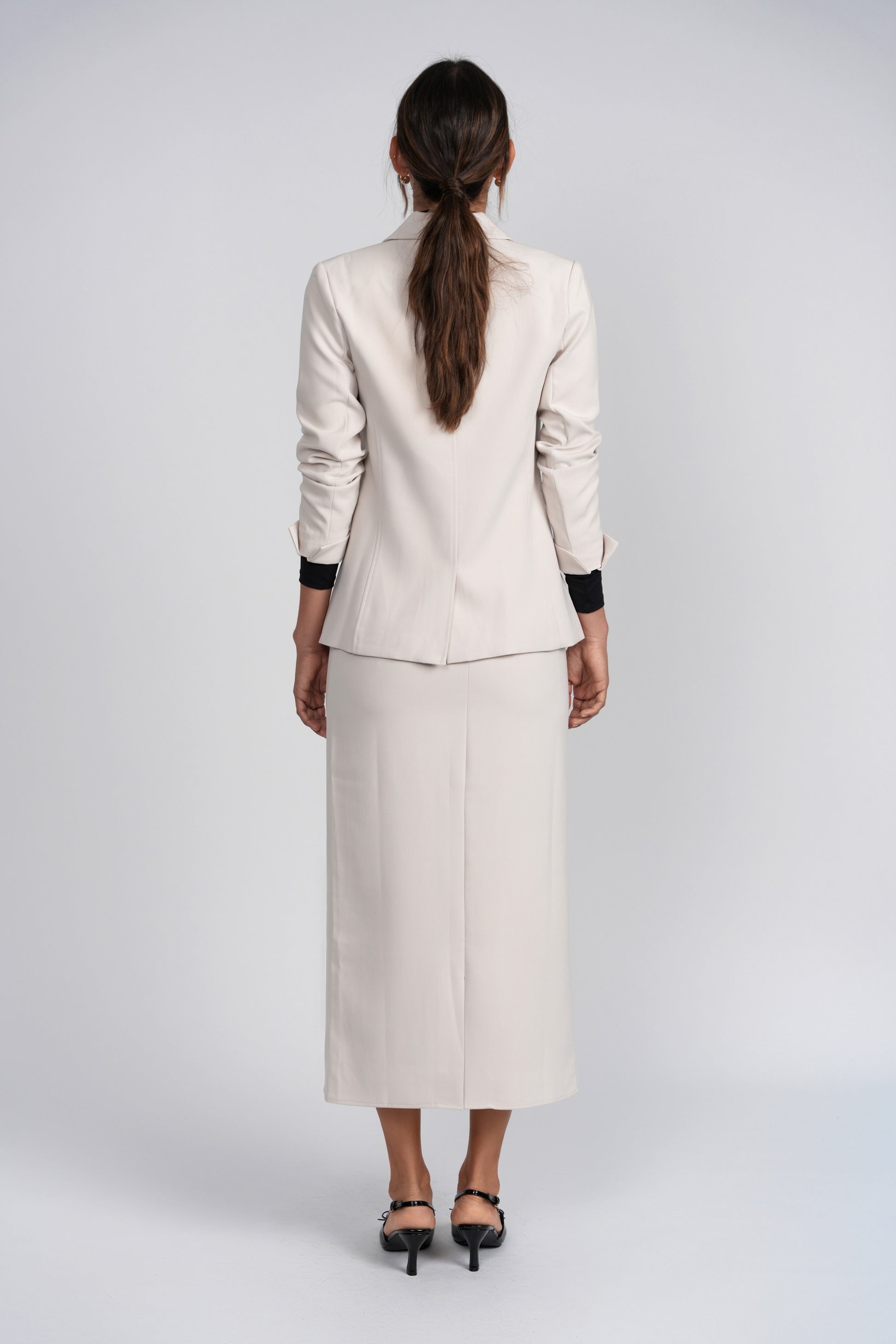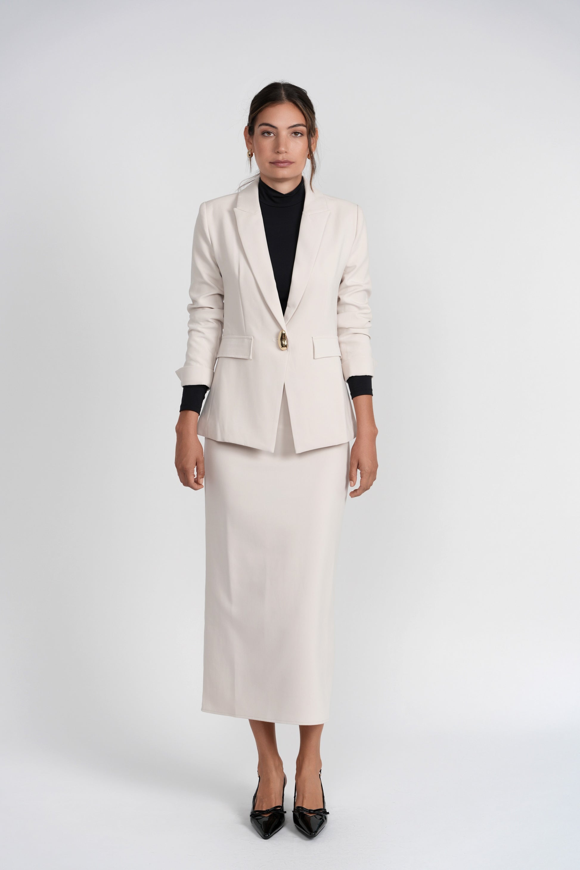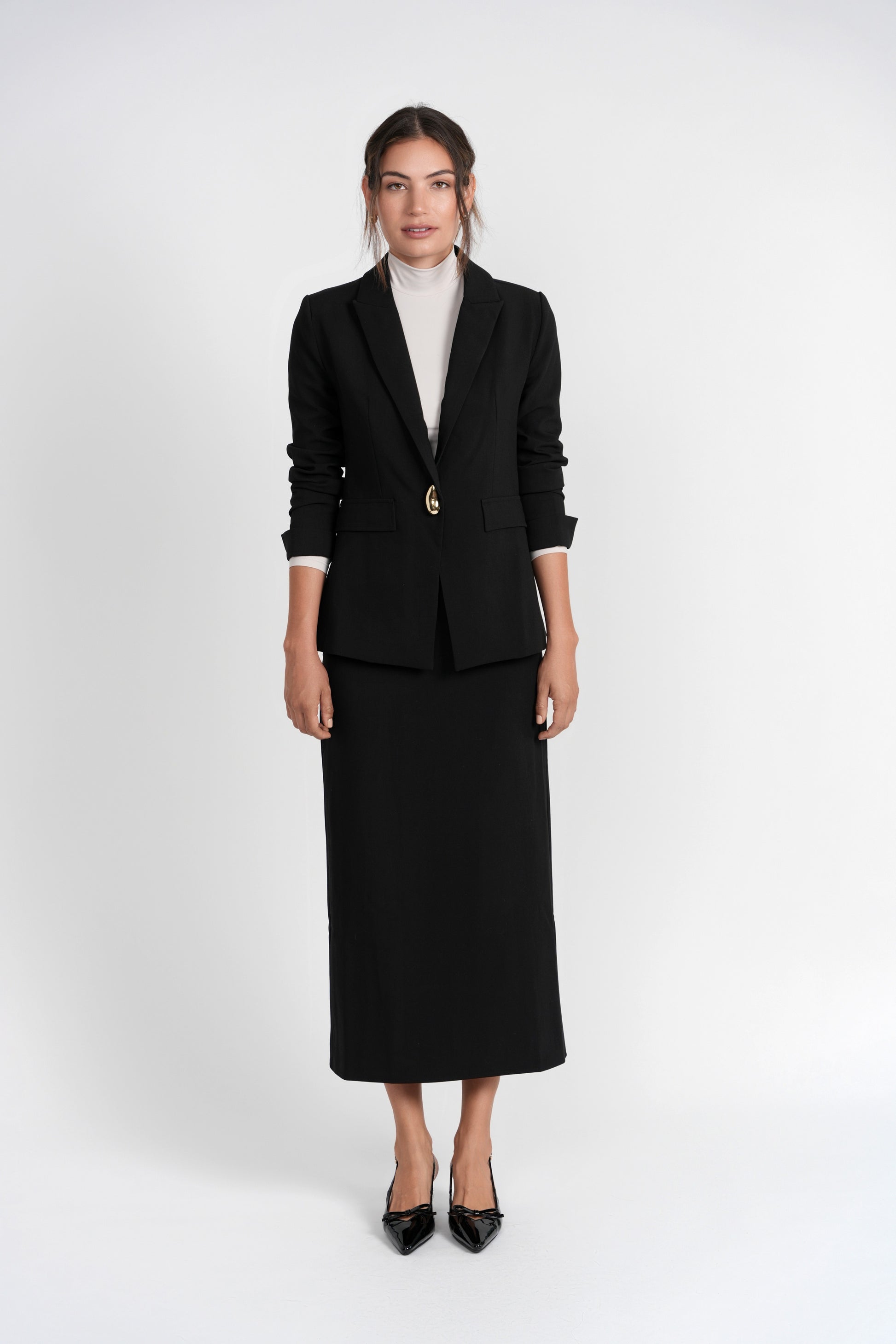 • The Gwen Skirt is a sleek straight maxi crafted from the same refined suiting fabric as the matching blazer.