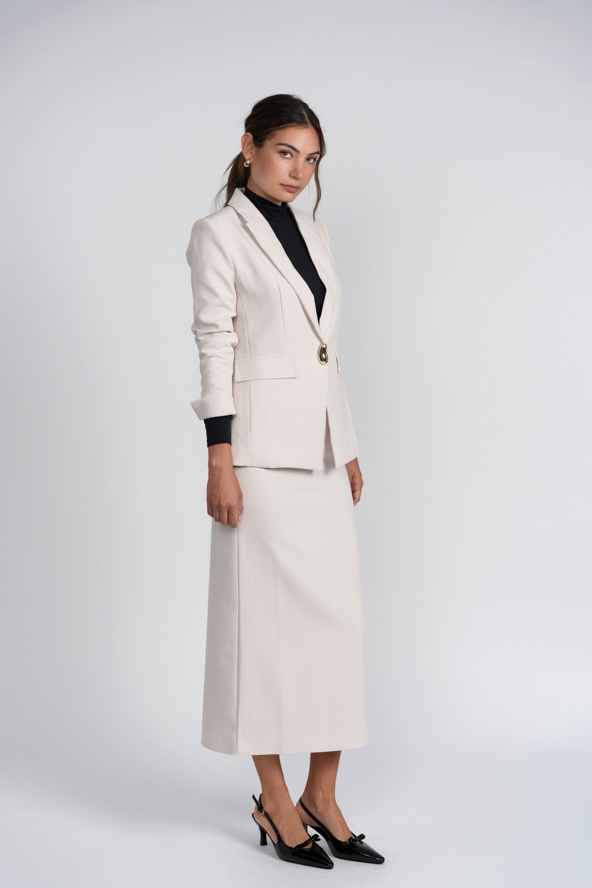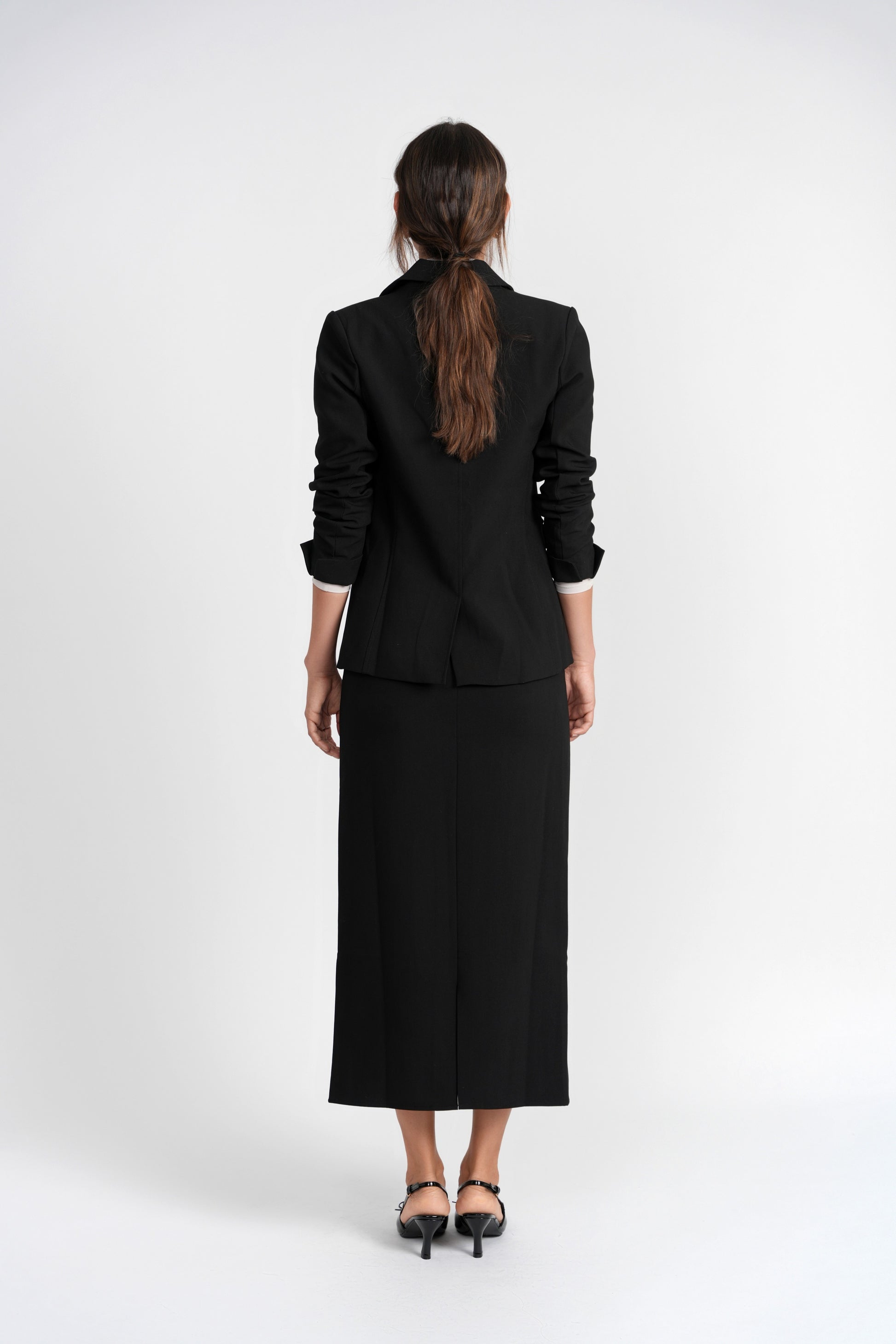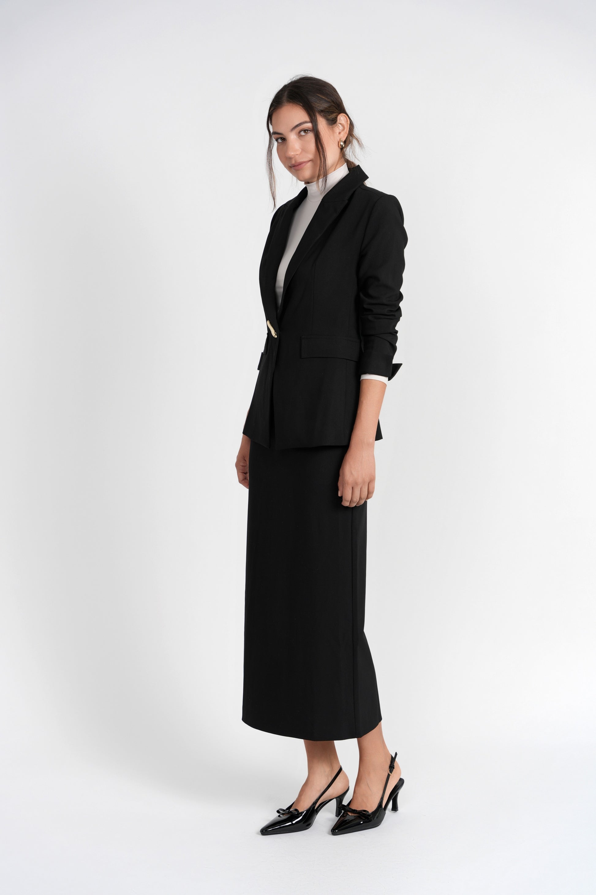 • The Gwen Skirt is a sleek straight maxi crafted from the same refined suiting fabric as the matching blazer.