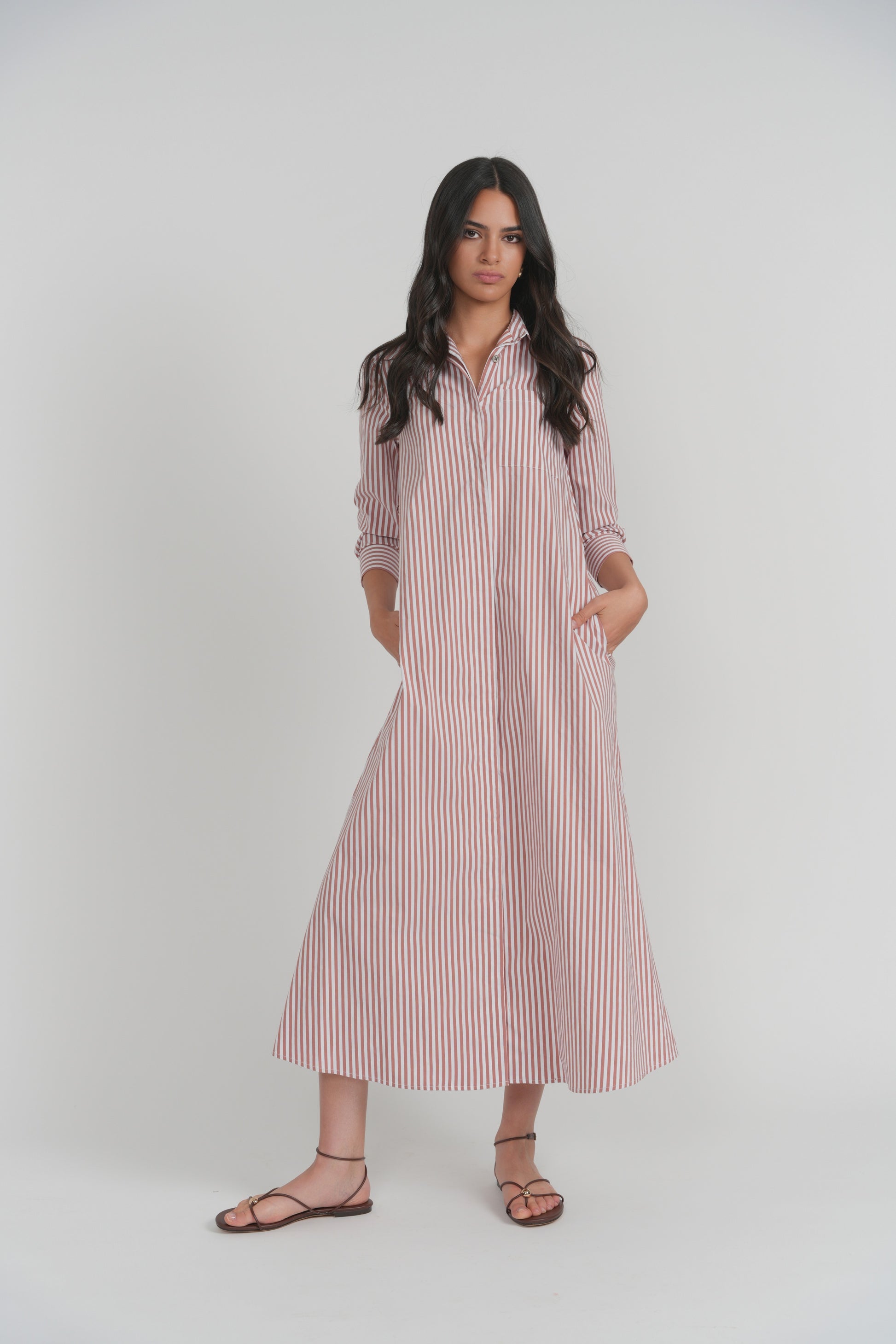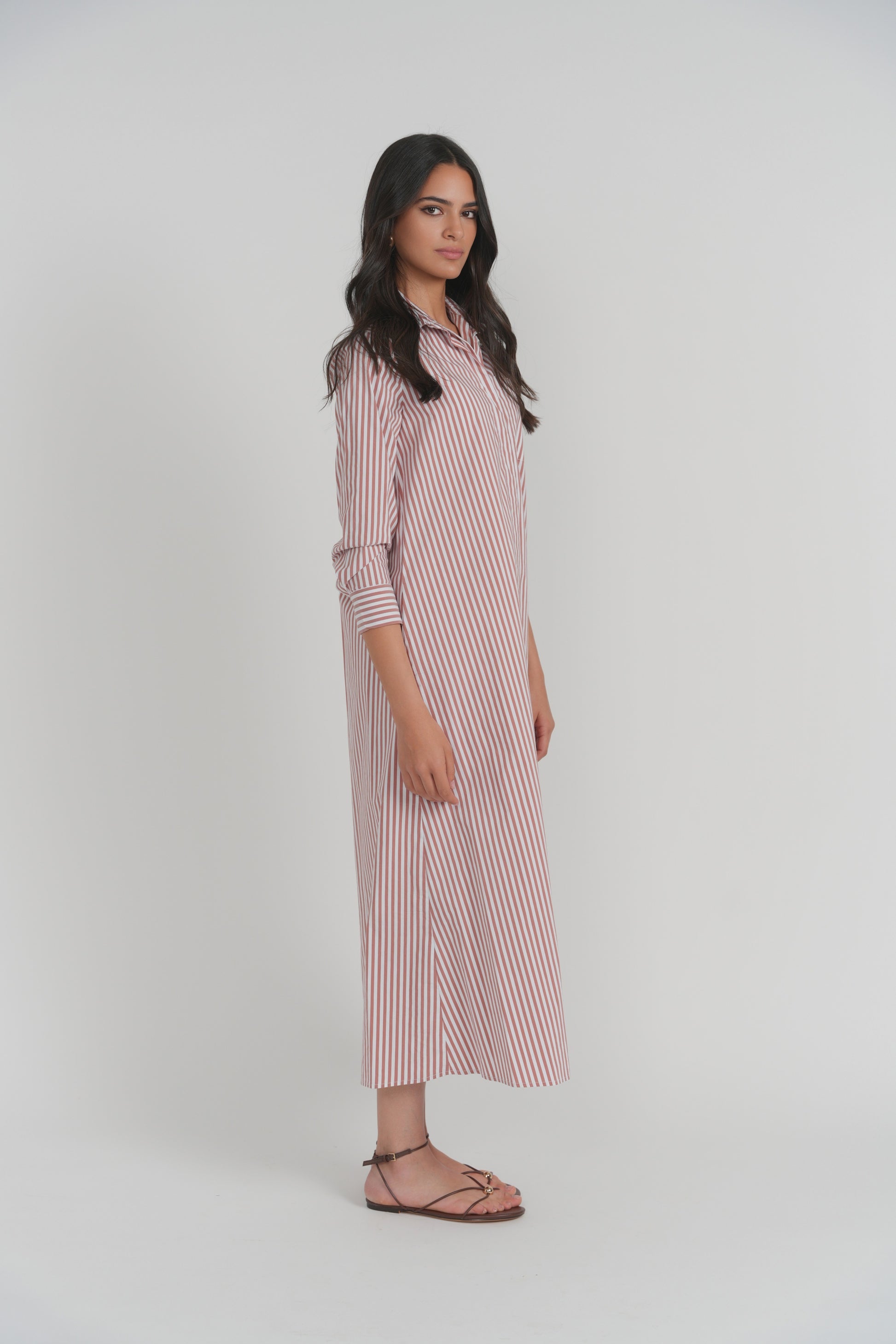 An effortless shirt dress with timeless appeal. Crafted from lightweight woven cotton with classic vertical stripes, the Lerici Dress features a relaxed button-front silhouette that skims the body with ease. Designed with a soft collar, long sleeves, and a fluid midi length, it offers an airy drape that moves beautifully. Polished yet unfussy, it's the kind of piece that transitions seamlessly from everyday wear to relaxed weekend styling.