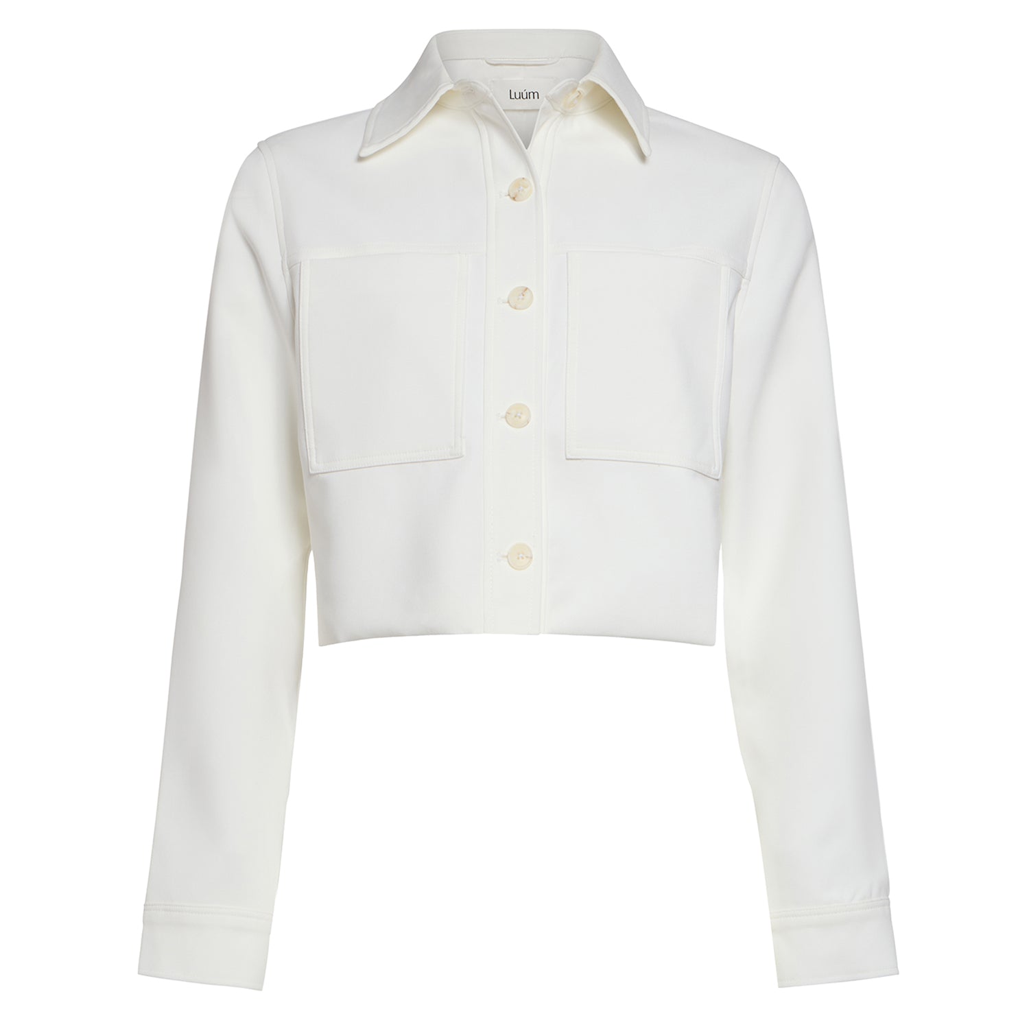 • The fitted cropped button-down top features a sharp collar, exuding polished refinement with a modern edge.
