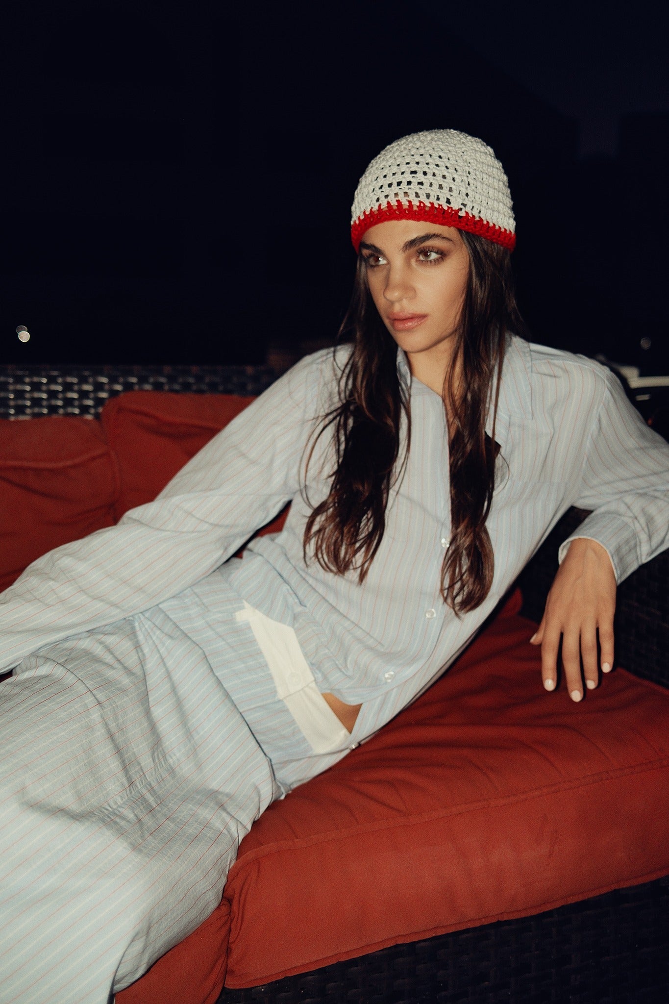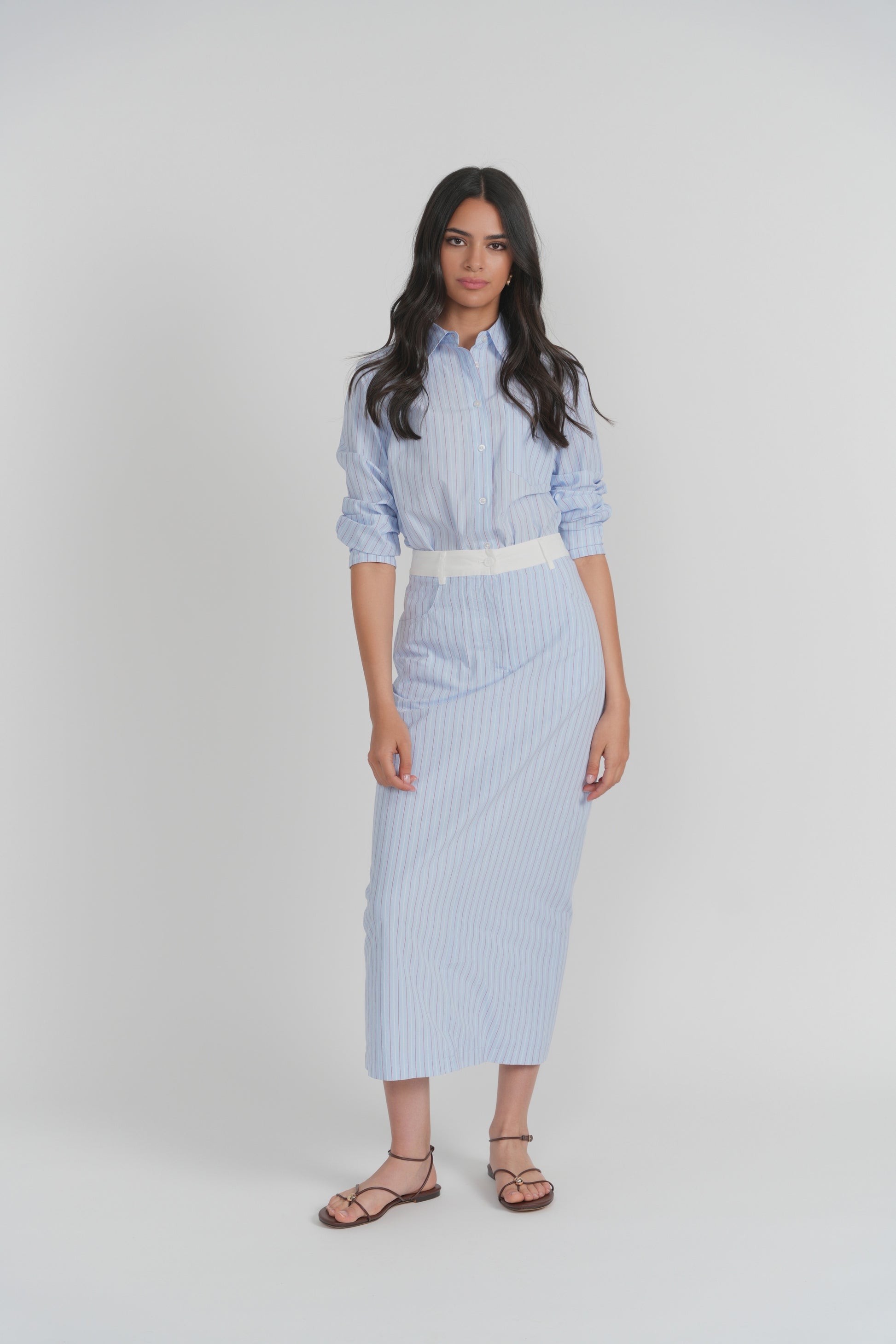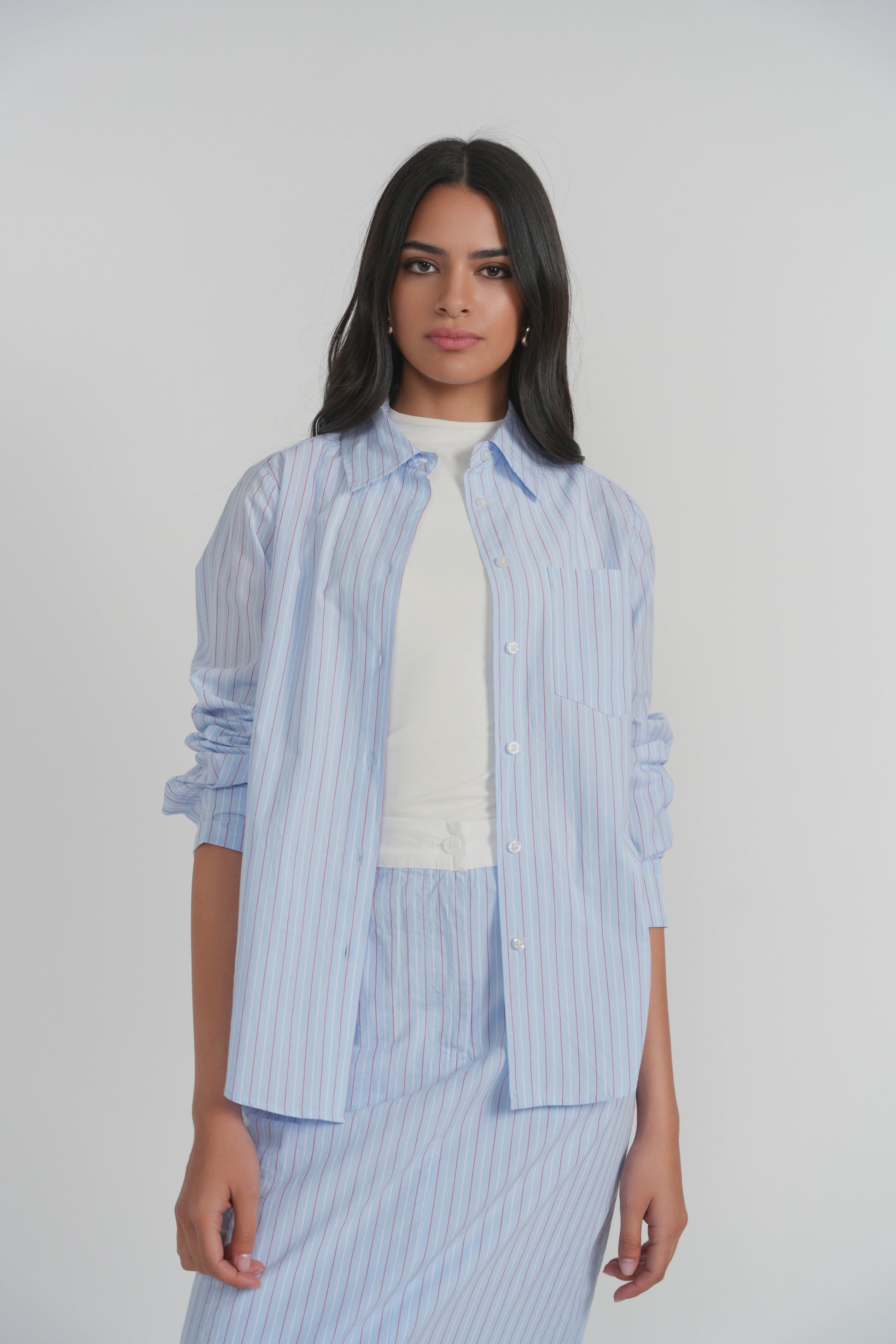 A timeless essential, reimagined in crisp cotton poplin. This button-down shirt features a classic collar, full front button closure, and a softly structured silhouette that feels polished yet effortless. The lightweight poplin fabric gives it a clean, breathable finish with just the right amount of structure for all-day wear. Designed with a relaxed straight fit, it drapes smoothly without clinging, making it easy to tuck or wear loose. Subtle vertical striping adds dimension while maintaining a refined, modern look.