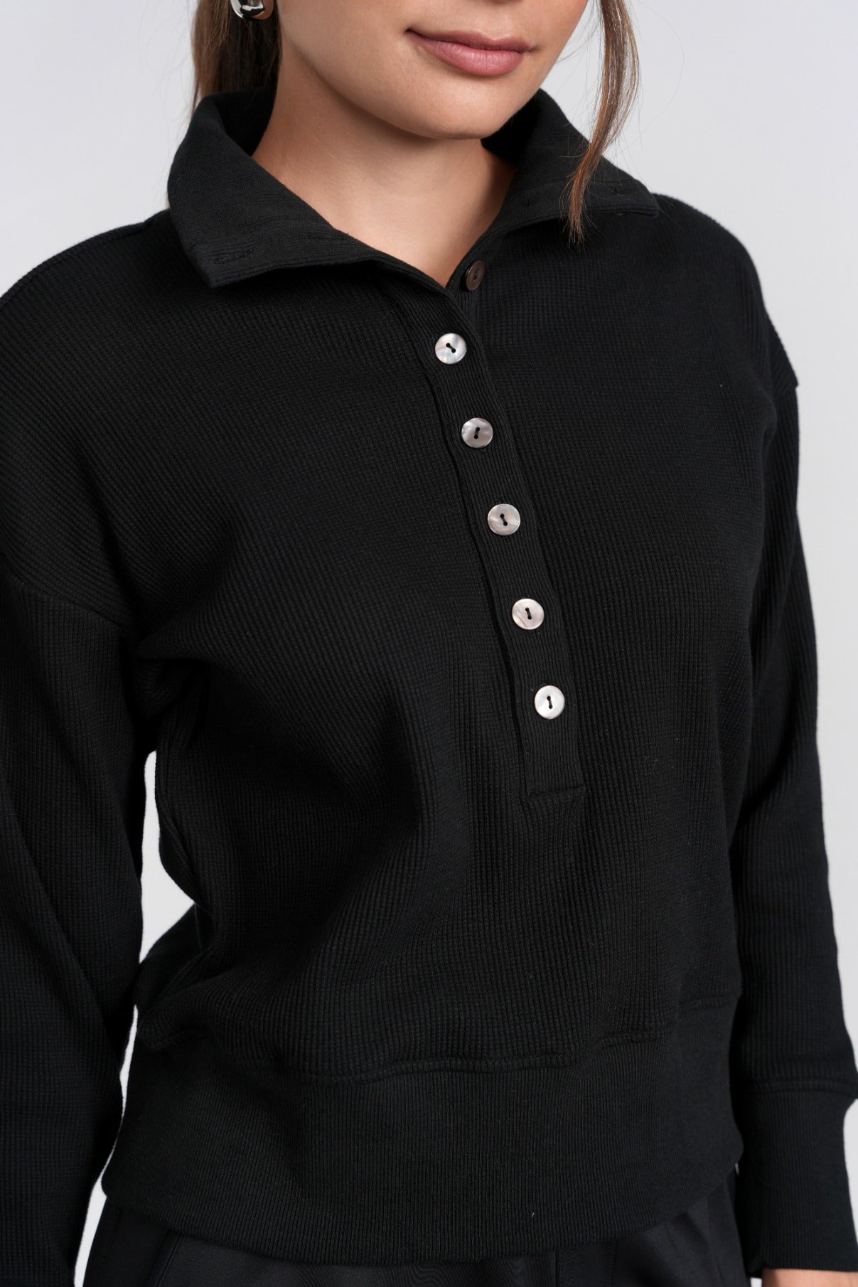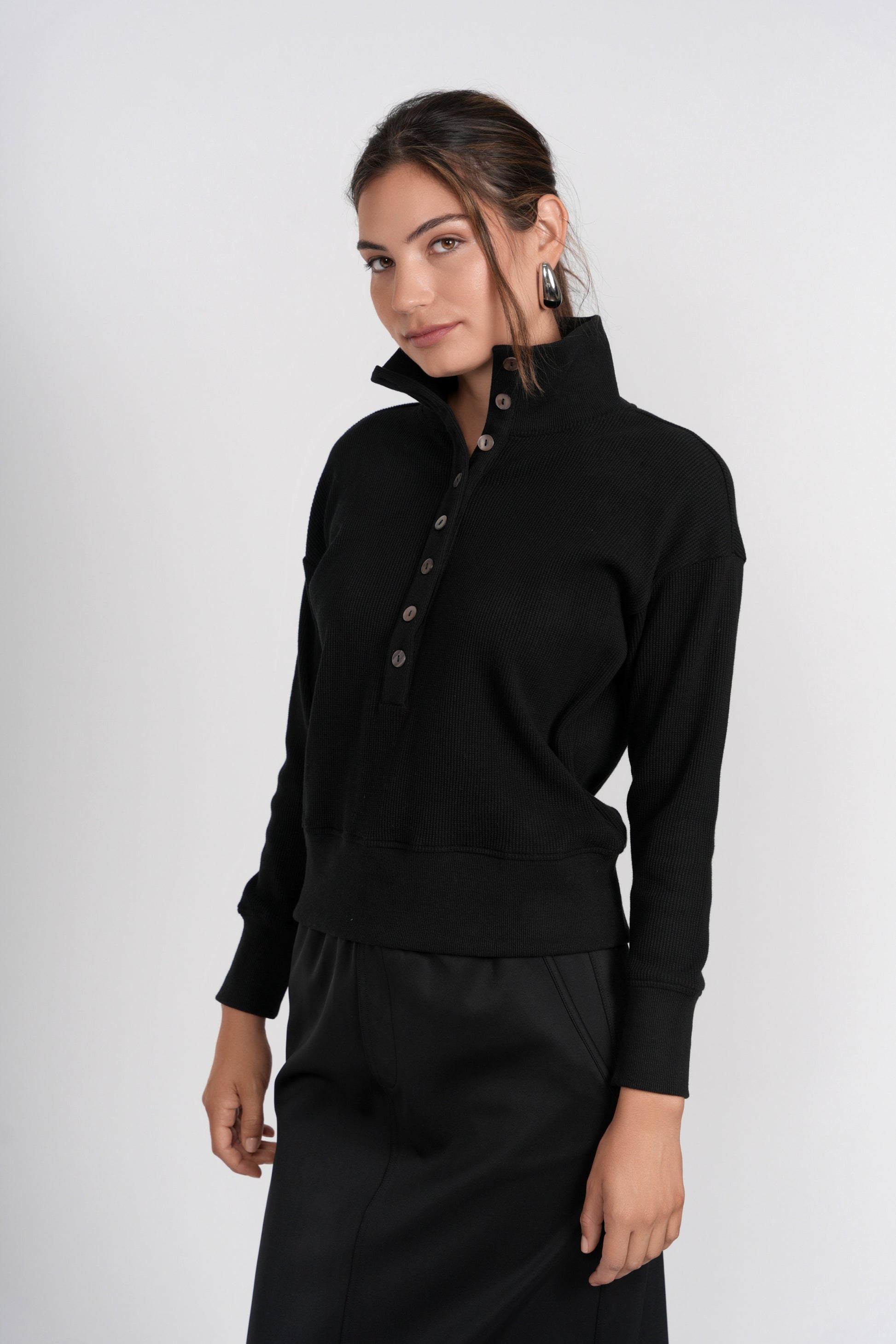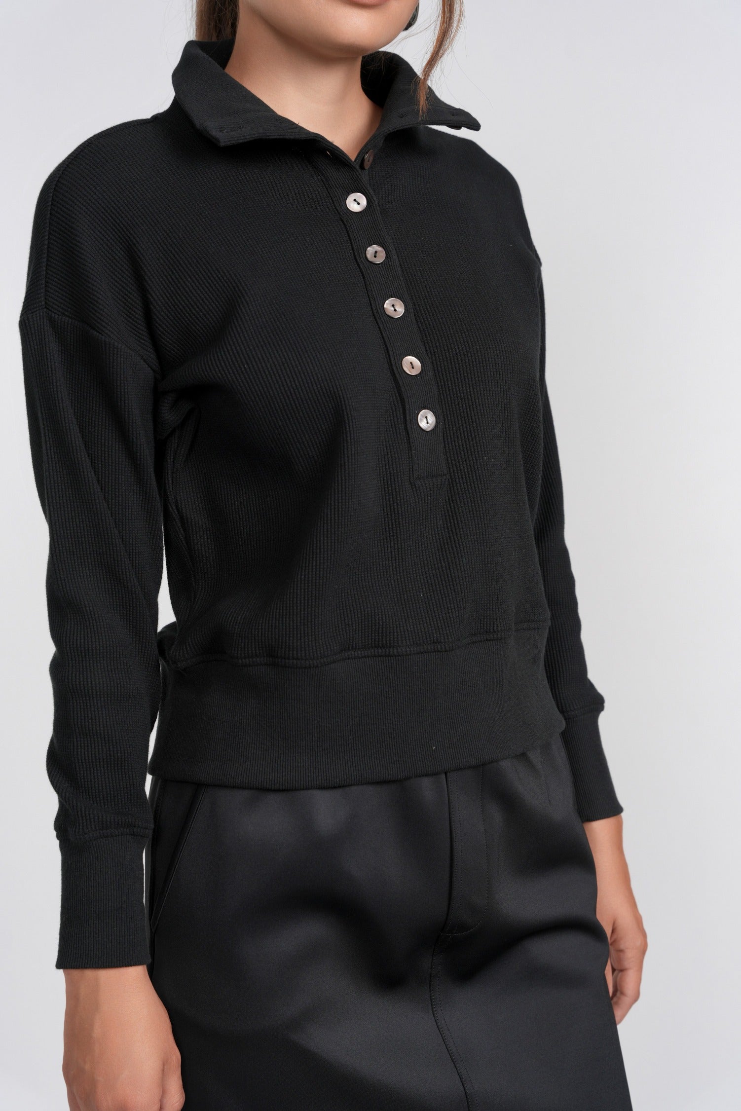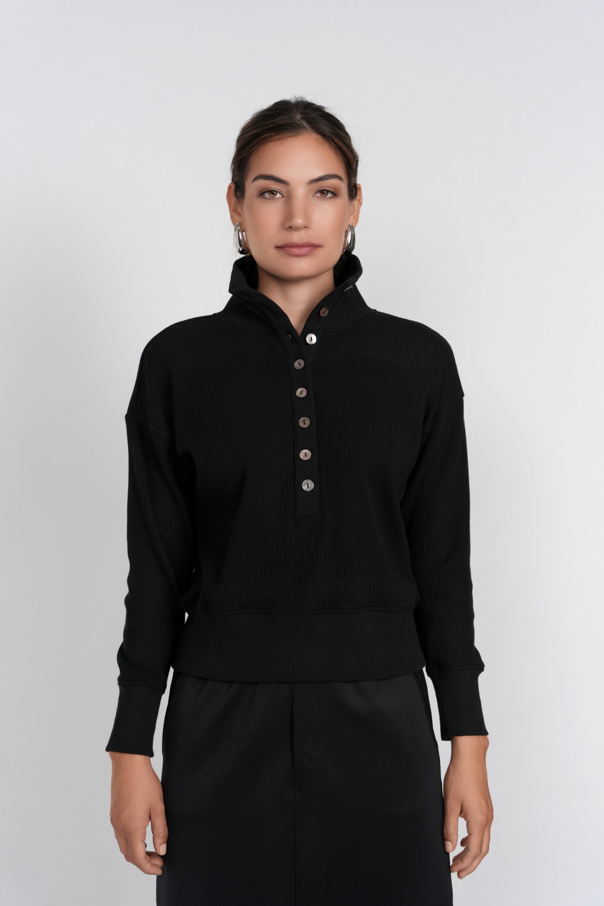 • The Sandy Top is a refined take on a classic Henley, crafted from a soft waffle-knit fabric that offers texture and comfort in equal measure.