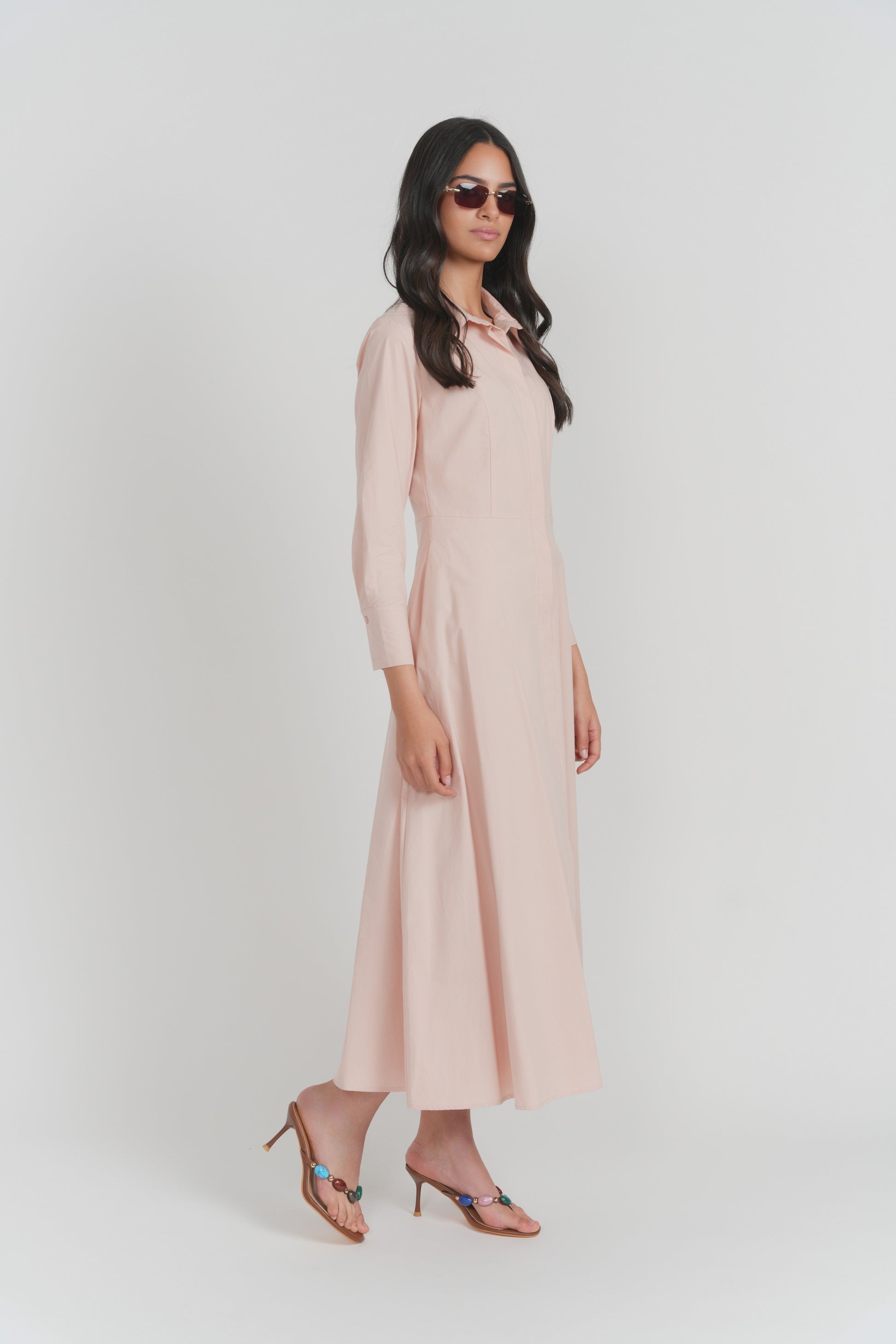 Crafted from a structured cotton poplin, the Sicilia Dress blends polish with ease. Designed with a defined waist seam, it creates subtle shape through the bodice before falling into a fluid, ankle-skimming skirt. The crisp fabric gives the silhouette a refined feel while remaining breathable and comfortable for all-day wear. An effortless piece that transitions seamlessly from daytime outings to dressed-up moments.